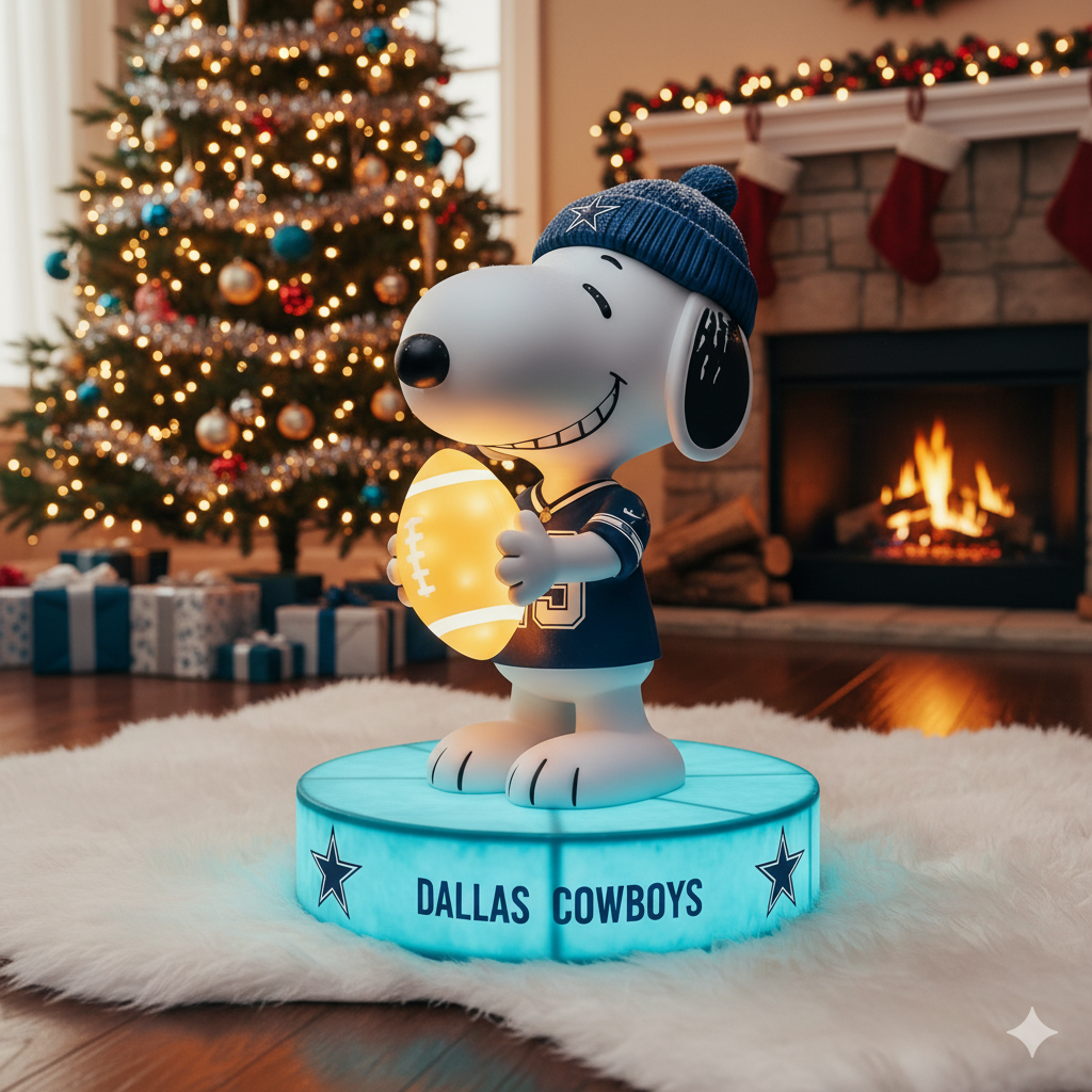 Imagine Snoopy, dressed in your team's authentic colors, complete with a beanie proudly displaying their logo, holding aloft a glowing LED football. Perched on a vibrant, illuminated base showcasing your team's name and twin logos, this figurine is a true celebration of sports and classic cartoon artistry. Whether it's game day, the holiday season, or just another day to show your loyalty, Snoopy is ready to cheer alongside you!