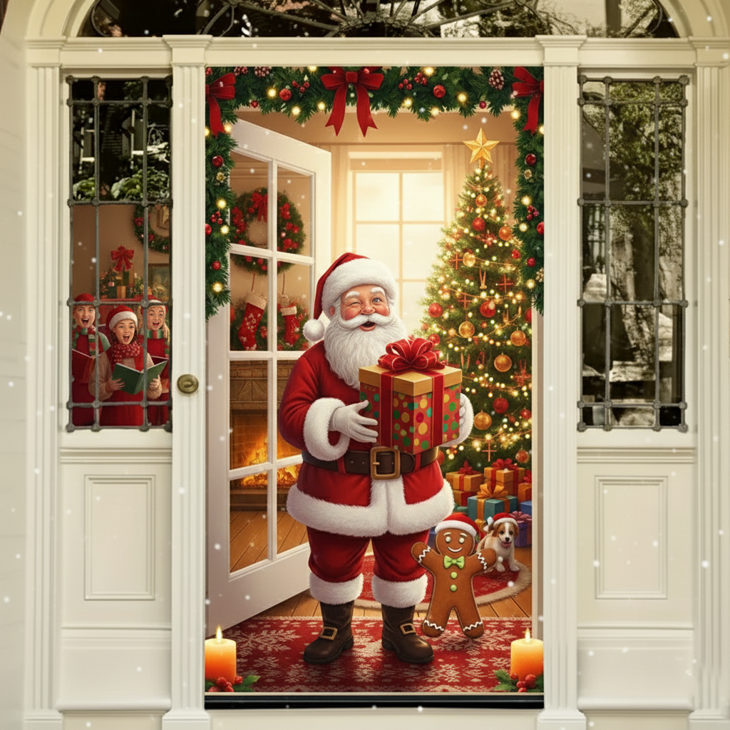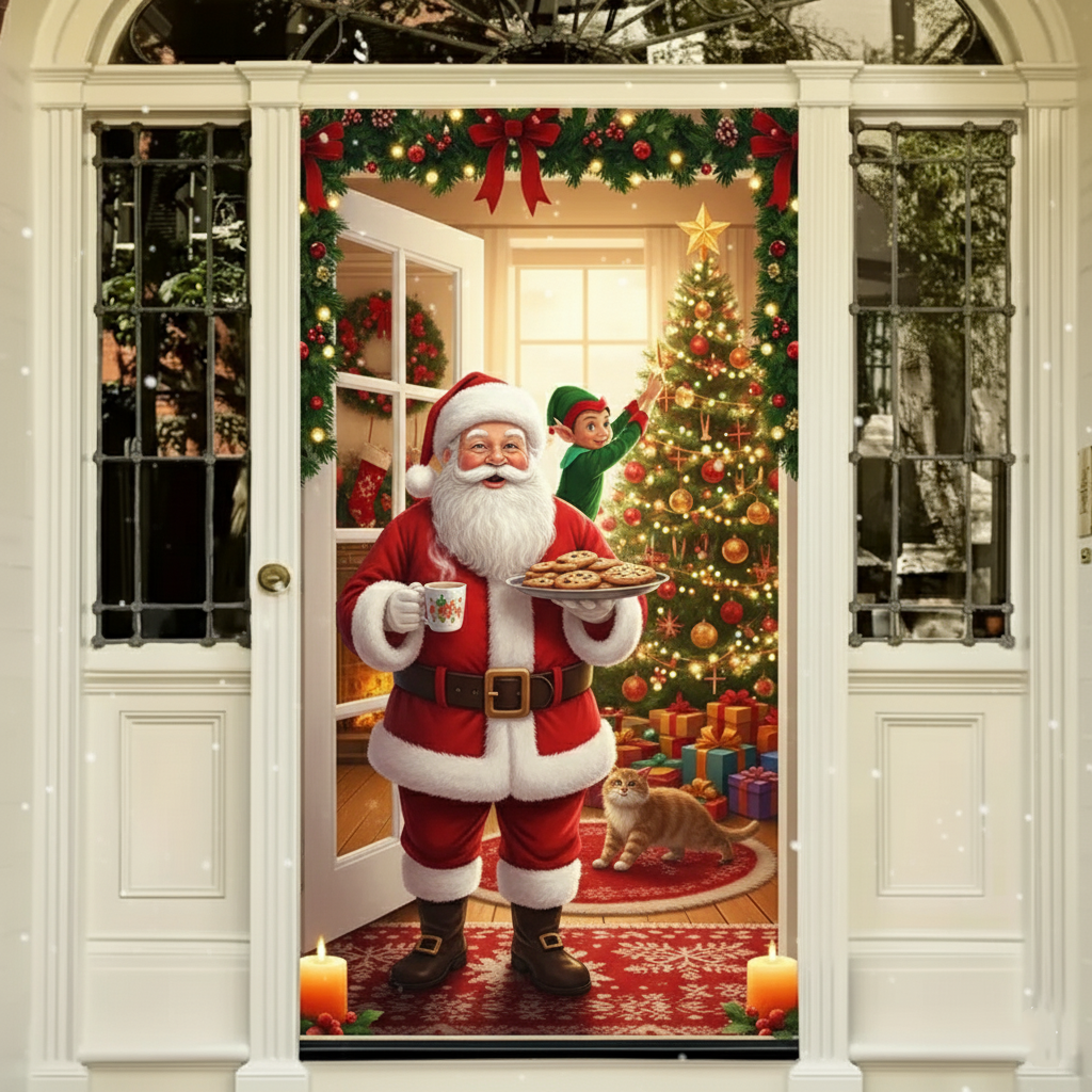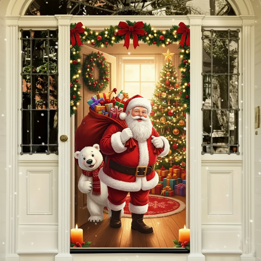 Santa Claus Door Frame Banner - Merry Christmas & Happy New Year Polyester Decoration, 70x35 inches